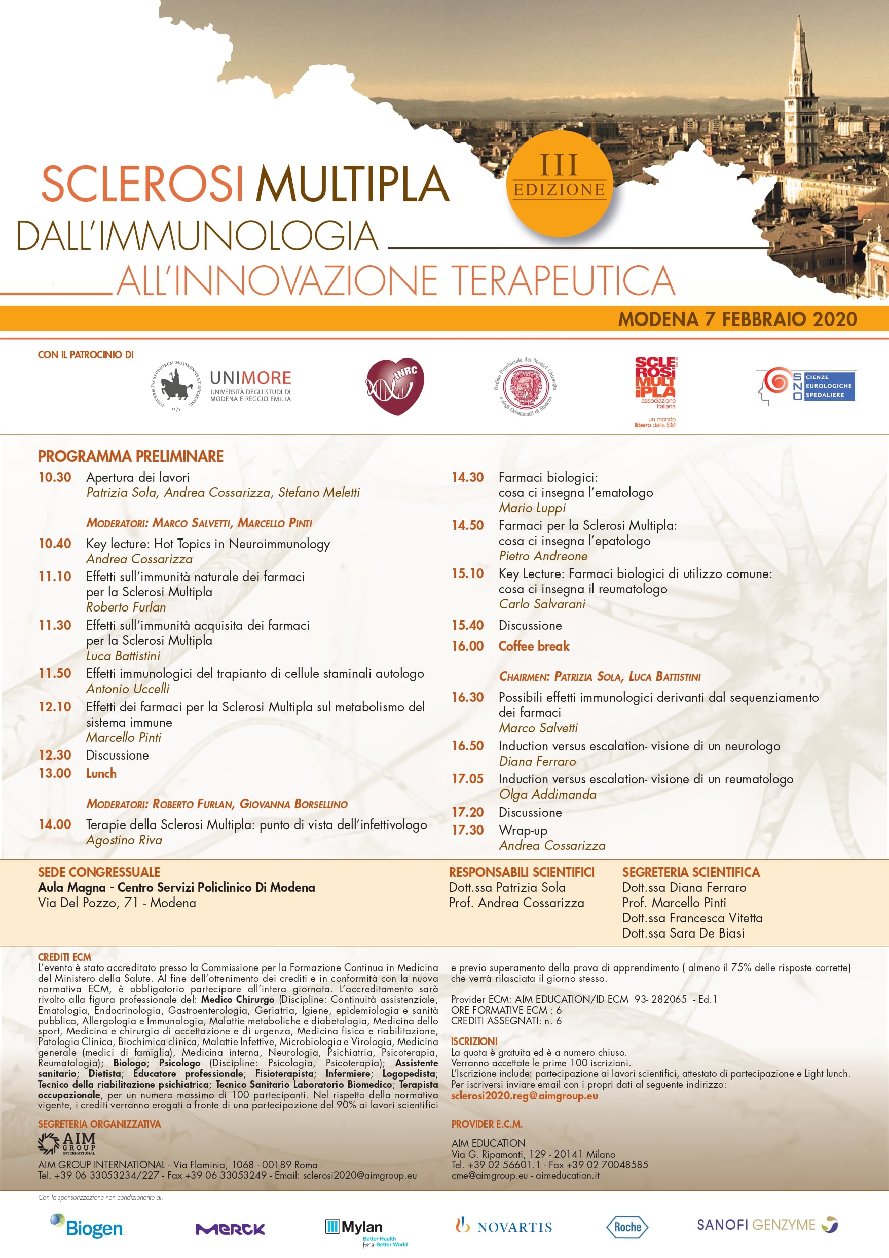 MODENA 7 FEBBRAIO 2020 CONVEGNO SCLEROSI MULTIPLA: DALL'IMMUNOLOGIA ALL'INNOVAZIONE TERAPEUTICA